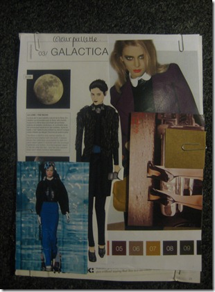 I love the idea of working with metallic, neutral and cool grey colours. We also had to choose a trend for Autumn/Winter 2012 to study from…